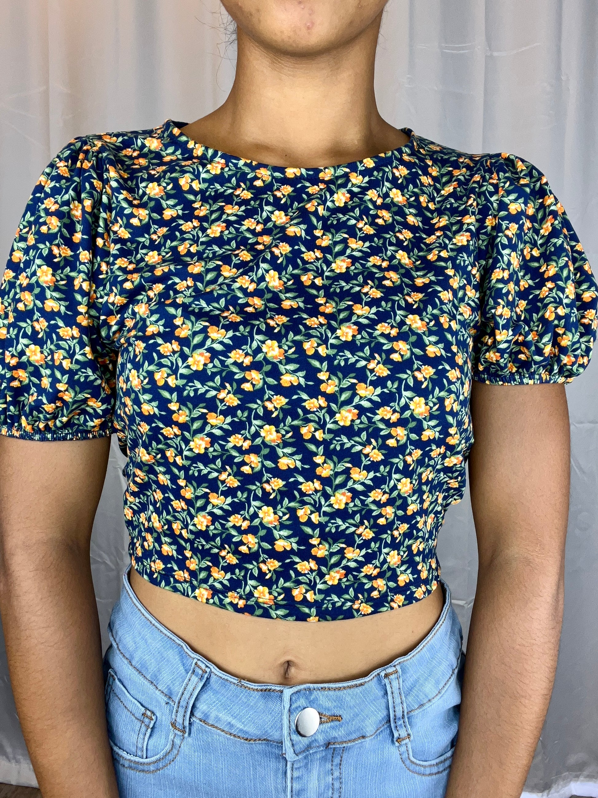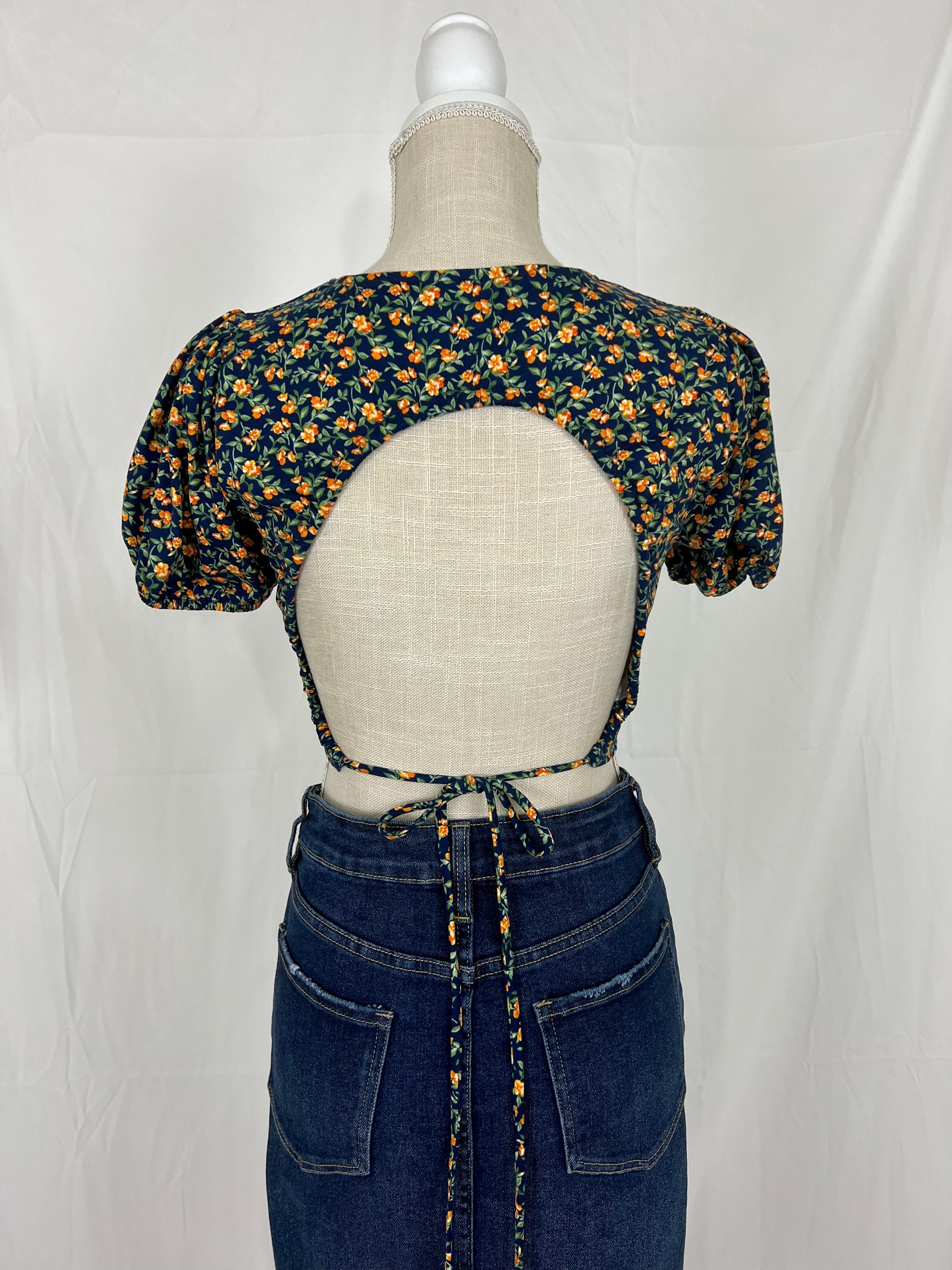 This is a cropped top with an open back and strings to tie on bottom back.