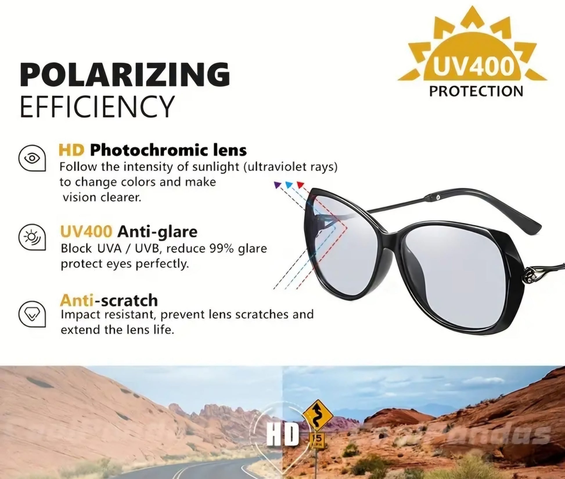 Photochromic, Polarized 400 UV Protection sunglasses.