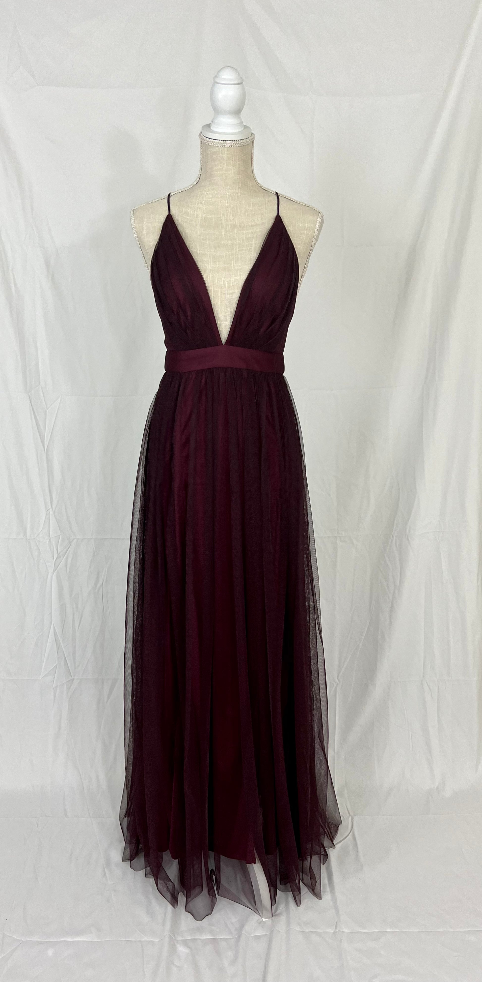 This is a deep v-neck line dress, with an open back and criss cross straps. (gently worn)