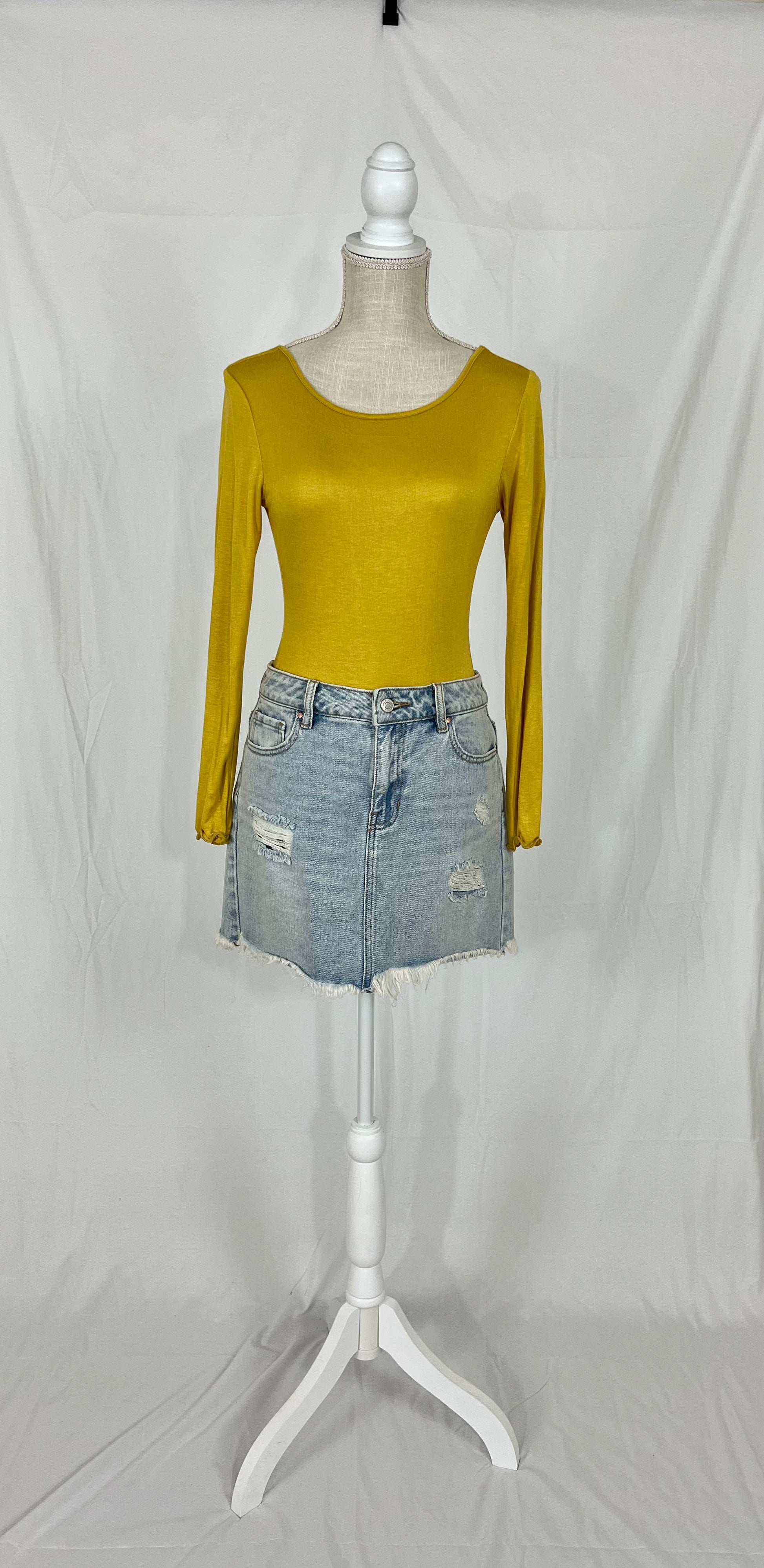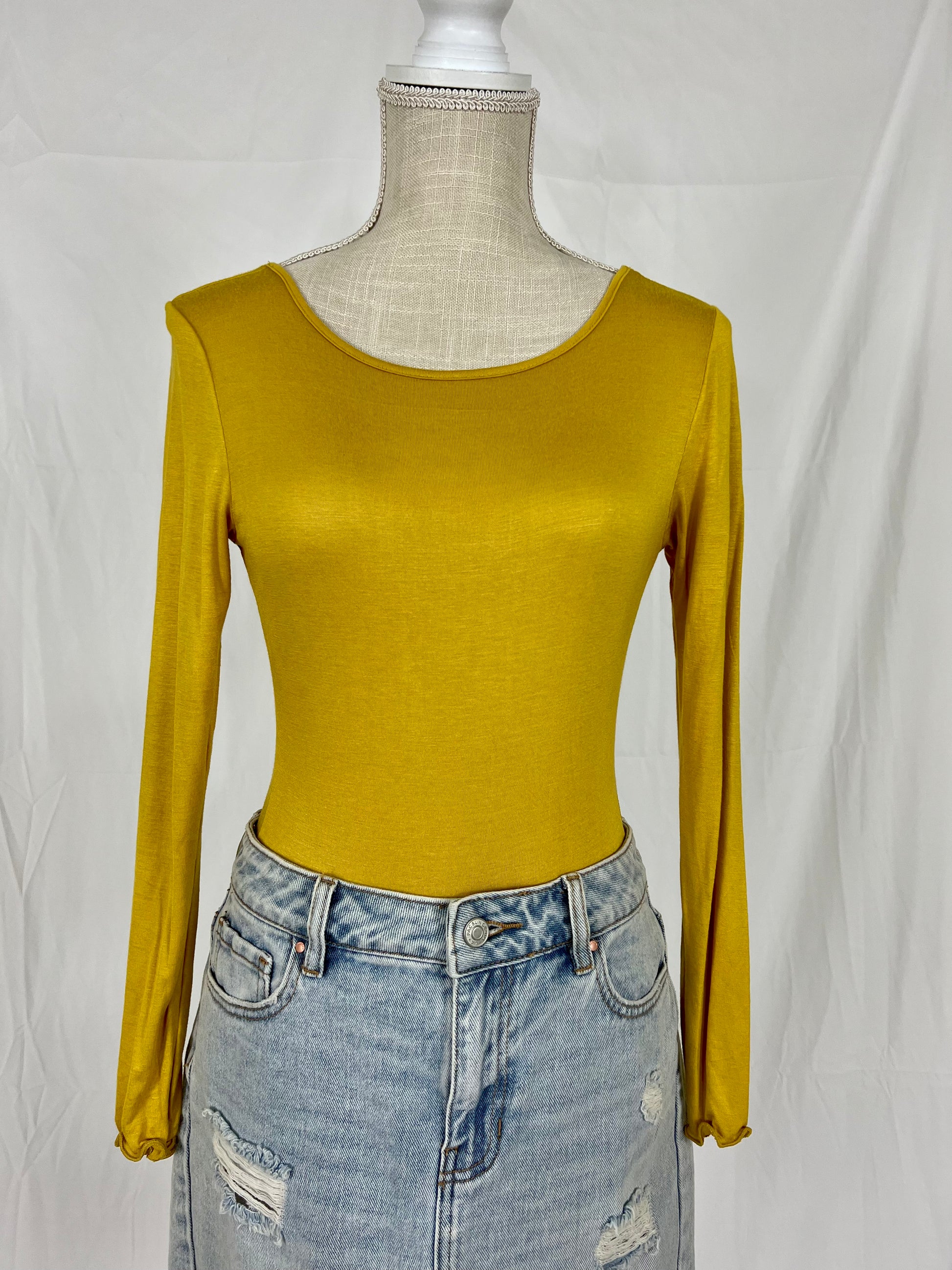 This is a long sleeve with lettuce trim bodysuit with an open back.