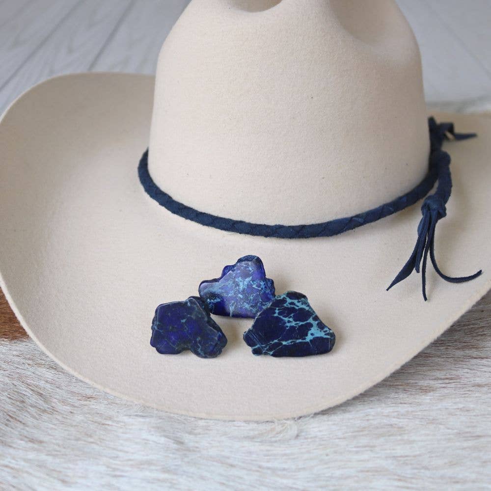 This ocean blue stone button hat pin features swirling coastal hues. Its smooth, rounded shape adds a subtle yet stylish detail to any felt or straw hat. A unique finishing touch that’s both versatile and eye-catching.