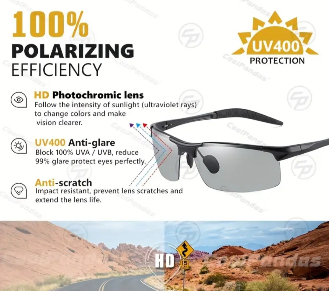 100% Polarizing. Gun frame Chameleon Lens. Photochromic. Anti Glare. Anti Scratch