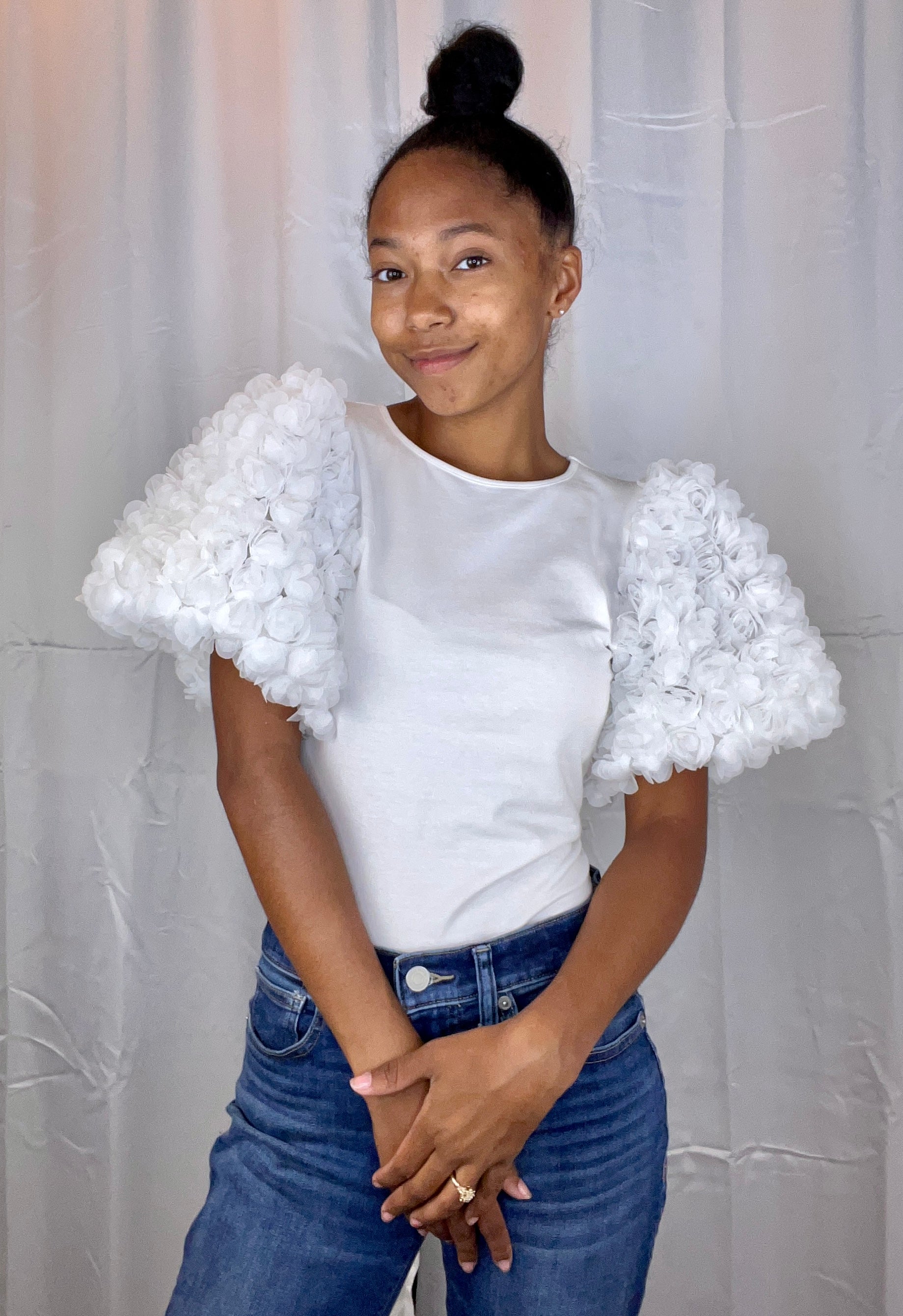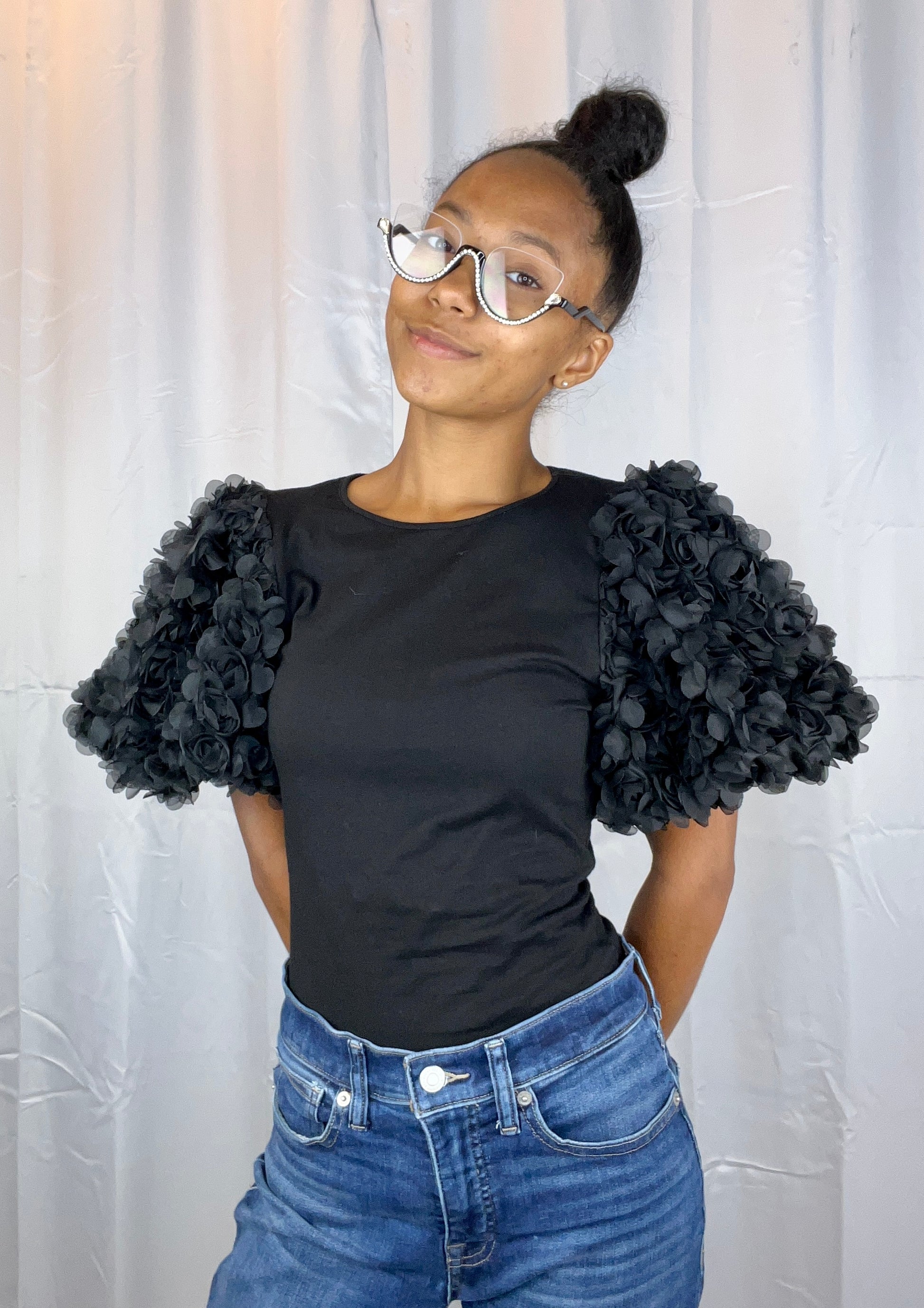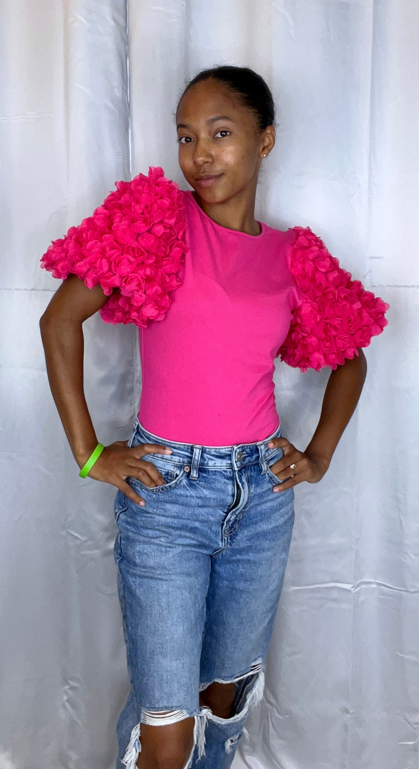 This is a bodysuit shirt with puffy sleeves, that have roses on them. Beautiful statement piece!