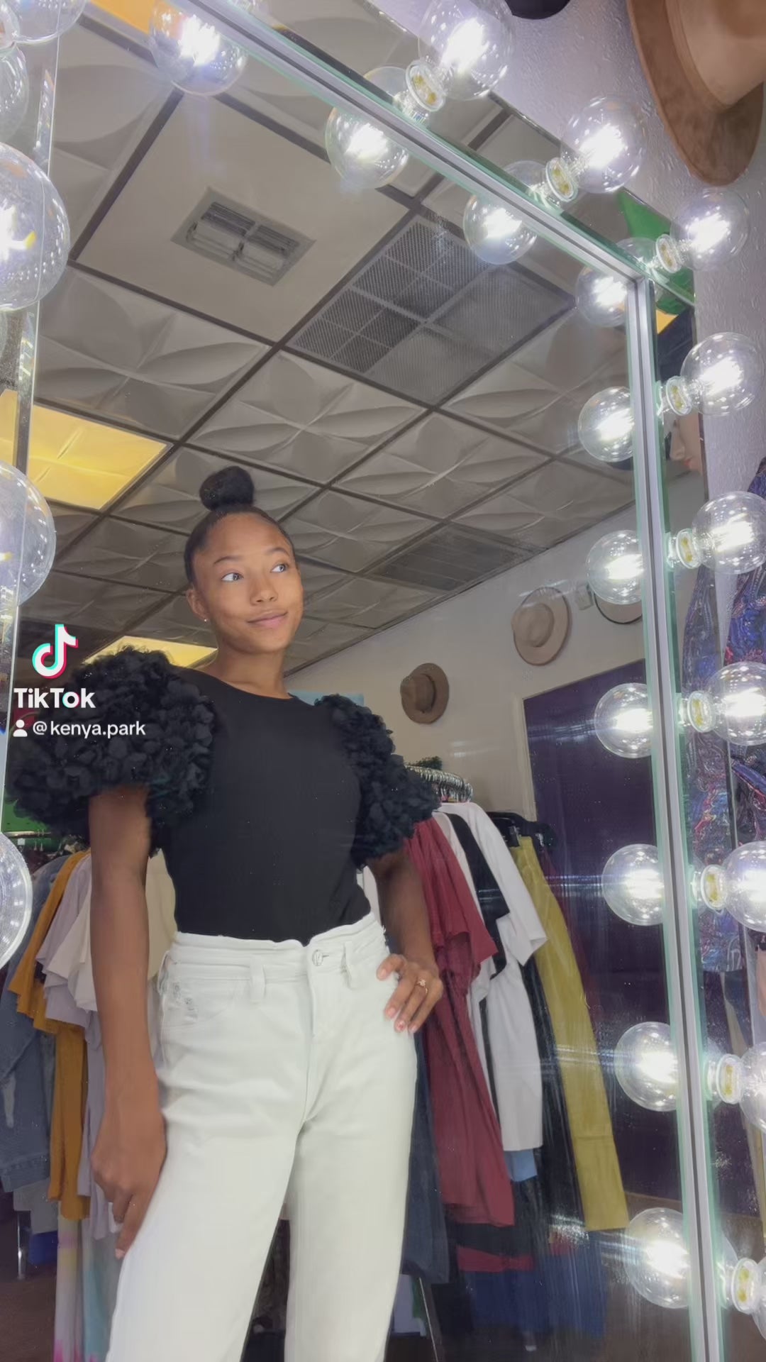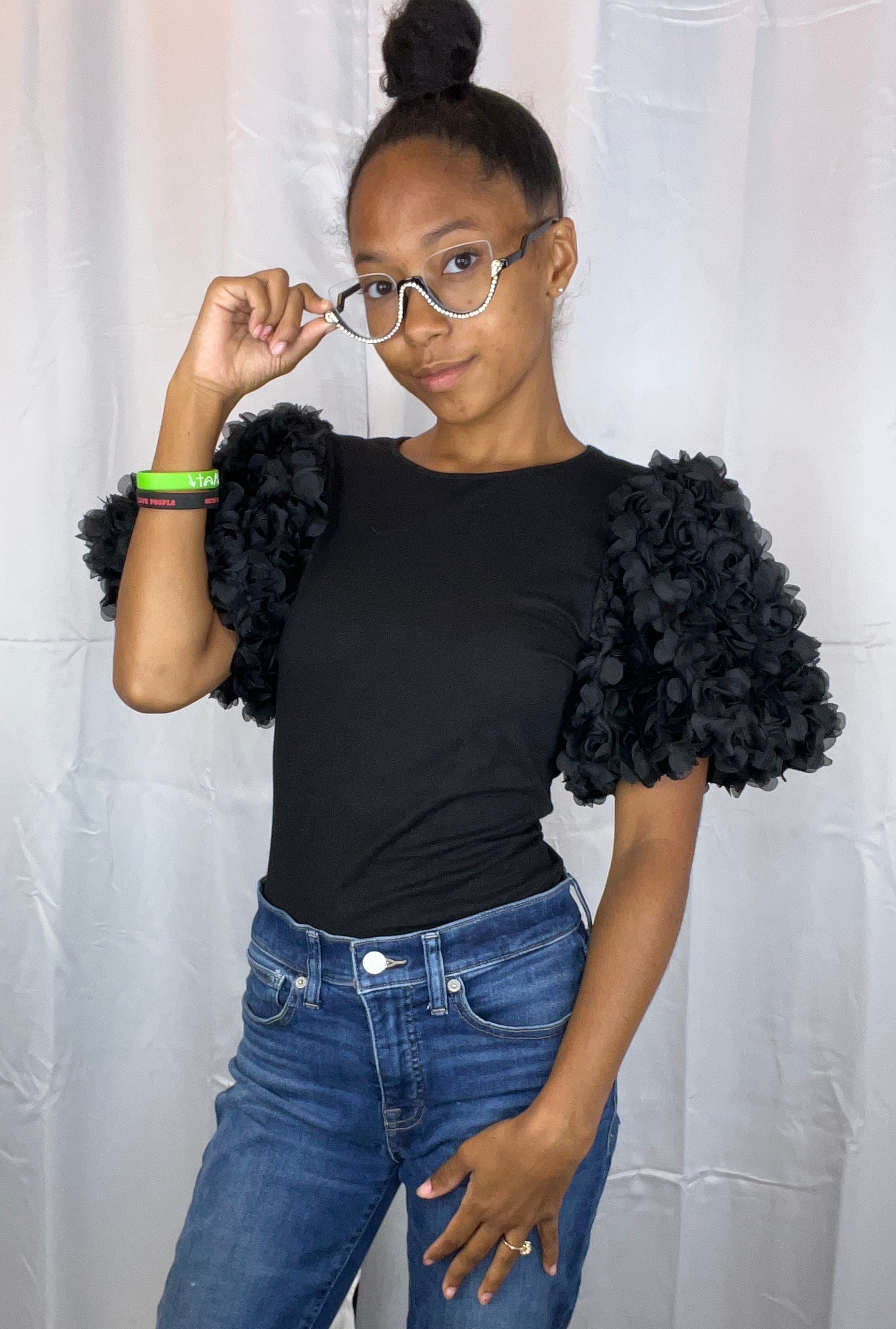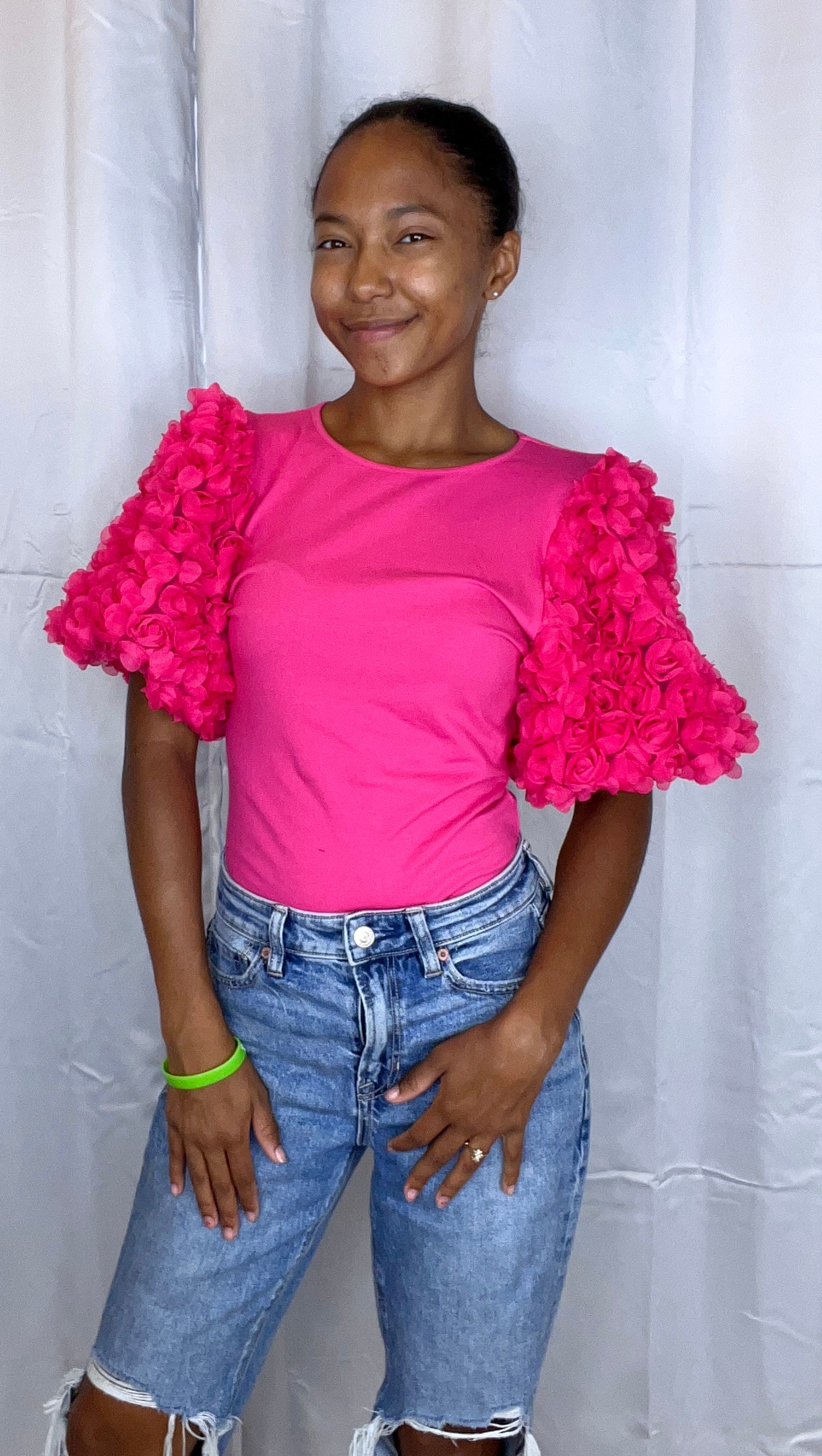 This is a bodysuit shirt with puffy sleeves, that have roses on them. Beautiful statement piece!