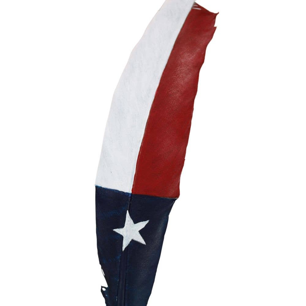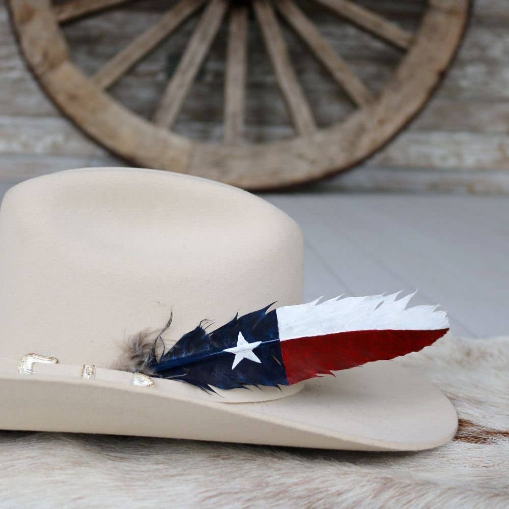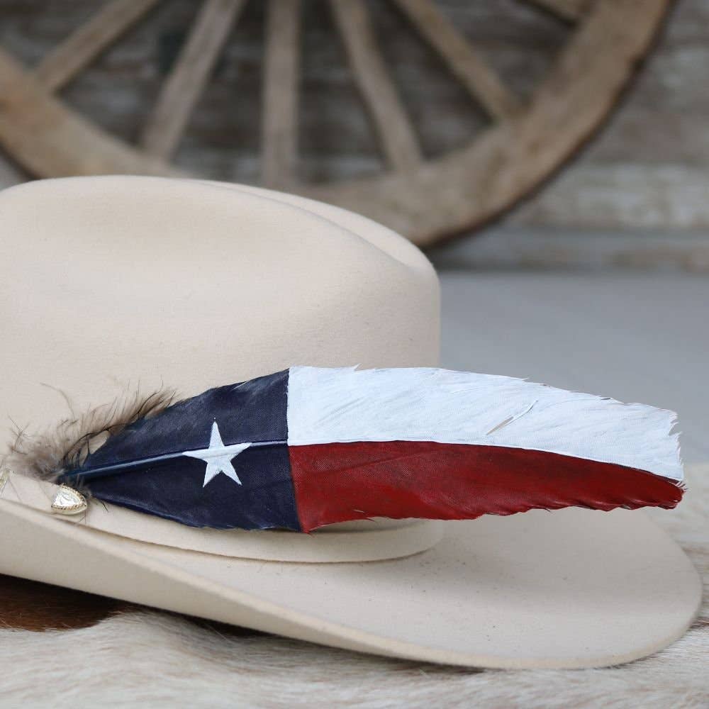 Show off your Texas pride with this hand-painted turkey feather, featuring a vibrant Texas flag design. Measuring approximately 8-10 inches, each feather is a unique, handcrafted piece of art. Perfect for adding a bold Texas touch to your hat.